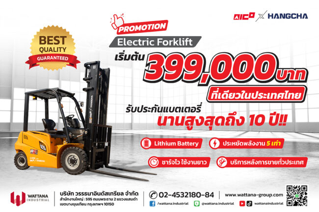 You are here: Home โปรแรงที่สุดในไทย! รถโฟล์คลิฟท์ไฟฟ้า (Electric Forklift) เริ่มต้นเพียง 399,000.- หมดเขต ตั้งแต่วันนี้ – 25 ธันวาคม 2568 หรือจนกว่าสินค้าหมด (สินค้าและของแถมมีจำนวนจำกัด) หมายเหตุ เงื่อนไขตามที่บริษัทกําหนด ในยุคที่ต้นทุนพลังงานพุ่งสูงขึ้น การปรับเปลี่ยนมาใช้เทคโนโลยีสะอาดคือหัวใจสำคัญของธุรกิจคลังสินค้าและโรงงานอุตสาหกรรม บริษัท วรรธนาอินดัสเทรียล จำกัด ขอแนะนำโปรโมชั่นสุดพิเศษสำหรับรถยกไฟฟ้าแบรนด์ชั้นนำ AICO x HANGCHA ที่ออกแบบมาเพื่อตอบโจทย์ความคุ้มค่าและความทนทาน “ที่เดียวในประเทศไทย” ทำไมต้องเลือก Electric Forklift จาก Wattana Industrial? เราไม่ได้มอบแค่เครื่องจักร แต่เรามอบทางเลือกที่คุ้มค่าที่สุดในประเทศไทย ด้วยข้อเสนอที่หาจากที่ไหนไม่ได้: ราคาเริ่มต้นเพียง 399,000 บาท: เป็นเจ้าของรถยกไฟฟ้าคุณภาพสูงในราคามิตรภาพ เพื่อช่วยลดภาระการลงทุนเบื้องต้น (CAPEX) ให้กับธุรกิจของคุณ รับประกันแบตเตอรี่นานสูงสุด 10 ปี: มั่นใจในคุณภาพด้วยการรับประกันที่ยาวนานที่สุด ตอกย้ำความทนทานของแบตเตอรี่ Lithium ที่เราเลือกใช้ ประหยัดพลังงาน 5 เท่า: เมื่อเทียบกับรถยกเครื่องยนต์สันดาป (น้ำมัน/ก๊าซ) ช่วยลดค่าใช้จ่ายด้านพลังงานต่อเดือนอย่างเห็นได้ชัด เทคโนโลยี Lithium Battery: ชาร์จไว (Fast Charge) ใช้งานได้ต่อเนื่องยาวนาน ไม่ต้องเสียเวลาดูแลรักษาเหมือนแบตเตอรี่น้ำกลั่นทั่วไป…